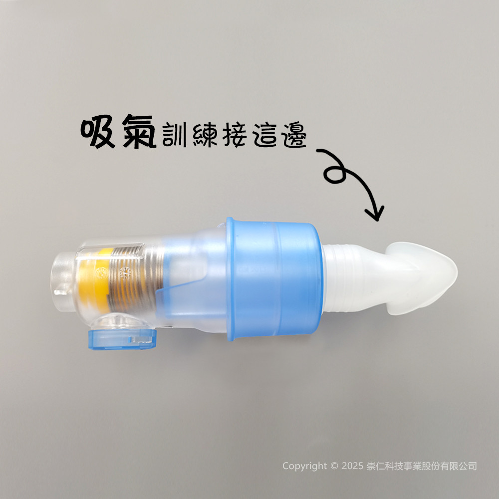 - [吸氣肌訓練]:先將阻力調到適合自己的強度,將嘴巴對好咬嘴後將嘴巴放置於呼吸肌訓練器吸器端,慢慢吐氣,將肺部的氣體慢慢吐乾淨後捏住鼻子,用力吸氣。