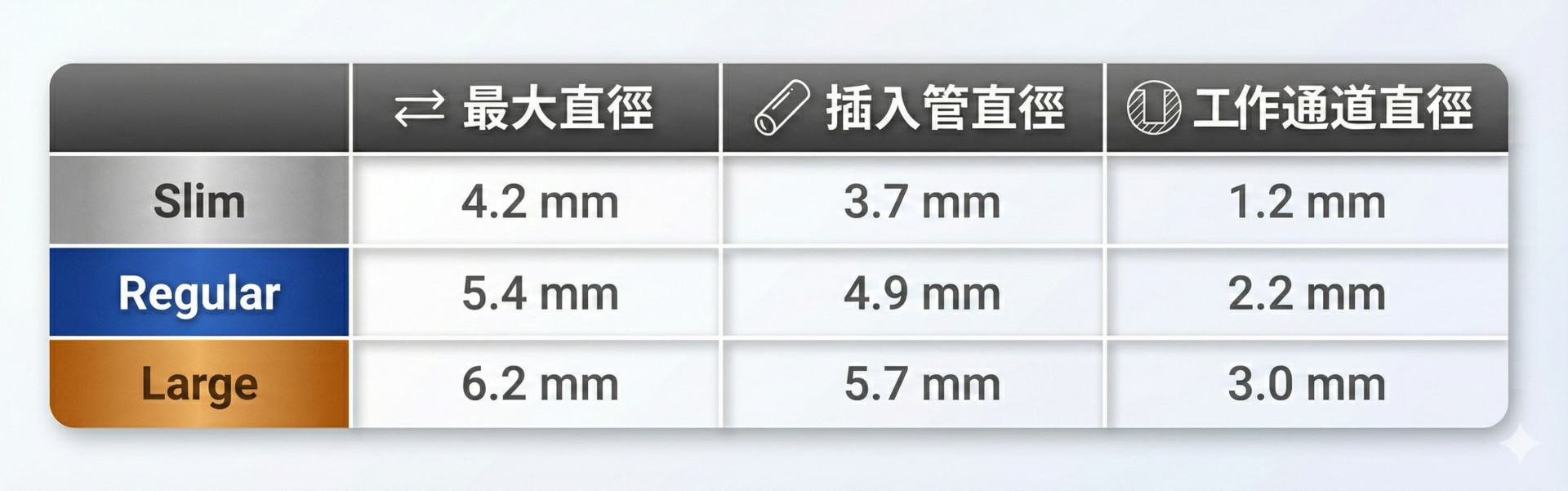 Large (大徑): 具備 3.0mm 大工作通道,提供卓越的抽吸效能與處置空間。